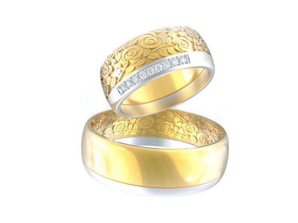 Ručne vyrobené zo 14 karátového žltého a bieleho zlata, časť obrúčky z bieleho zlata je povrchovo upravená rhódiom.