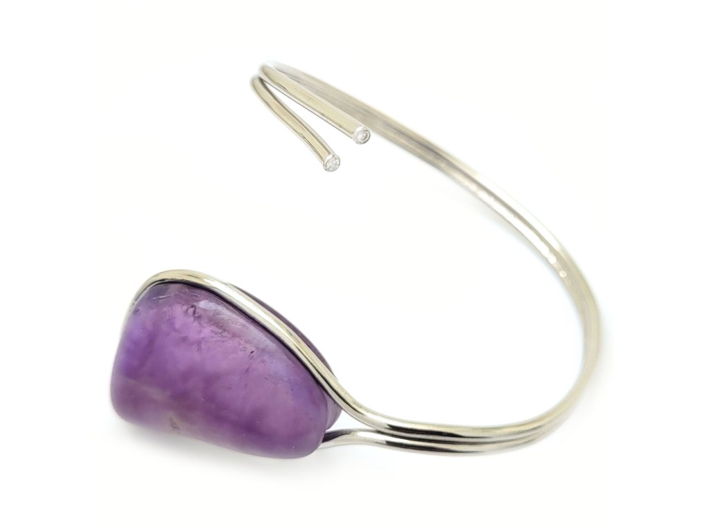 Platinový náramok Mirrol drží upokojujúci a meditatívny kameň ametyst. Ukončený dvoma jemnými briliantami sa stane neprehliadnuteľným doplnkom Vášho outfitu. Či už hľadáte originálny darček, alebo autentický kúsok, náramok Mirrol prekoná Vaše očakávanie.